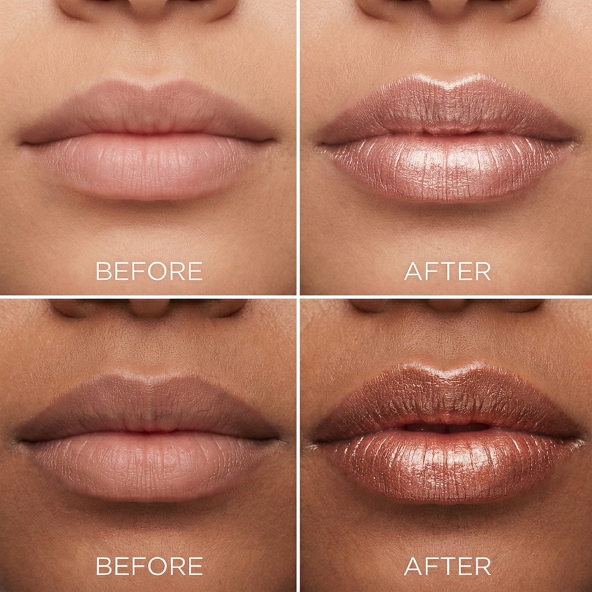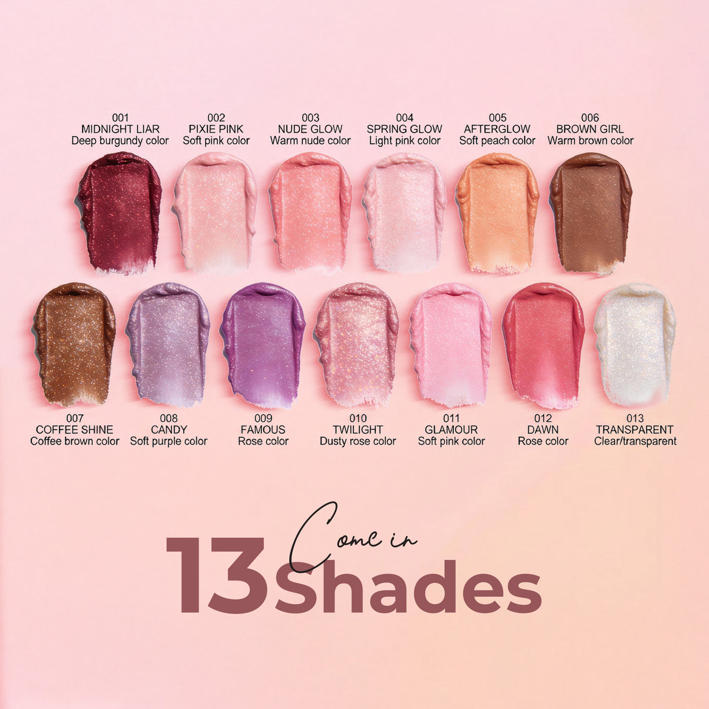 Shimmer Bomb Lip Gloss: This suggests that the lip gloss has a high-shine finish with shimmering particles, adding sparkle and dimension to the lips.