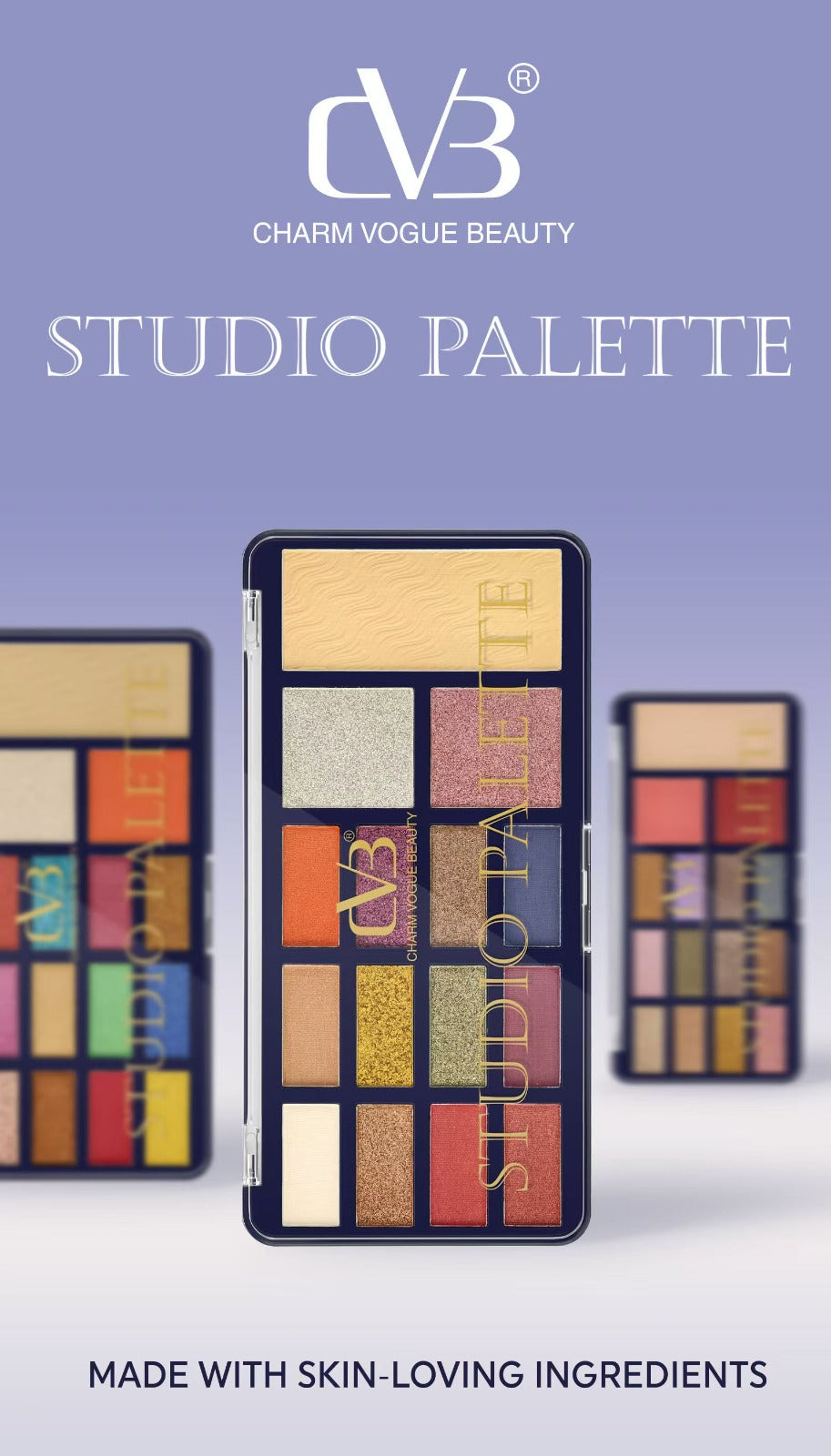 The CVB Studio Palette is an all-in-one makeup palette featuring 12 eyeshadows, 1 blush, 1 highlighter, and 1 compact powder, making it a versatile choice for both everyday and glam looks.